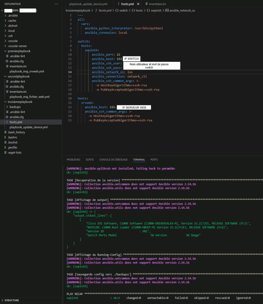 | Ce playbook s’exécute sur le switch principal Cisco listé dans le fichier hosts.yml. | ![]() |