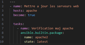 | Un premier playbook qui a permis de mettre à jour le service Apache sur les serveurs WEB : | ![]() |