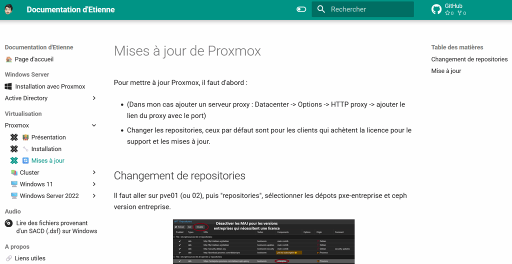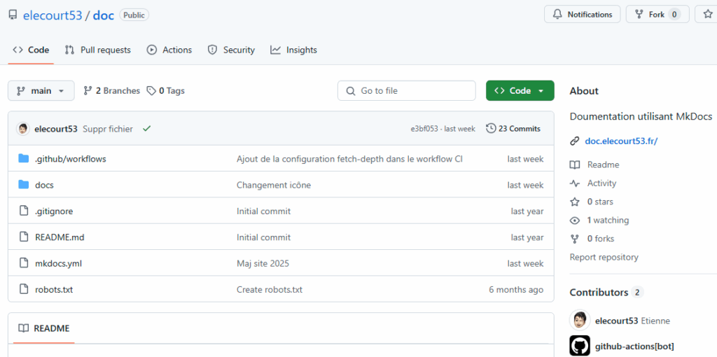 | Pour publier la documentation sur une page, il faut utiliser les actions GitHub : Il faut créer un dossier “.github” et un autre “workflows”. A l’intérieur de ce dossier, créer un fichier ci.yml. C’est dans ce fichier qu’il faut aussi indiquer les commandes à faire (comme installer des plugins). Il faut donc faire un commit avant de publier le site. | |