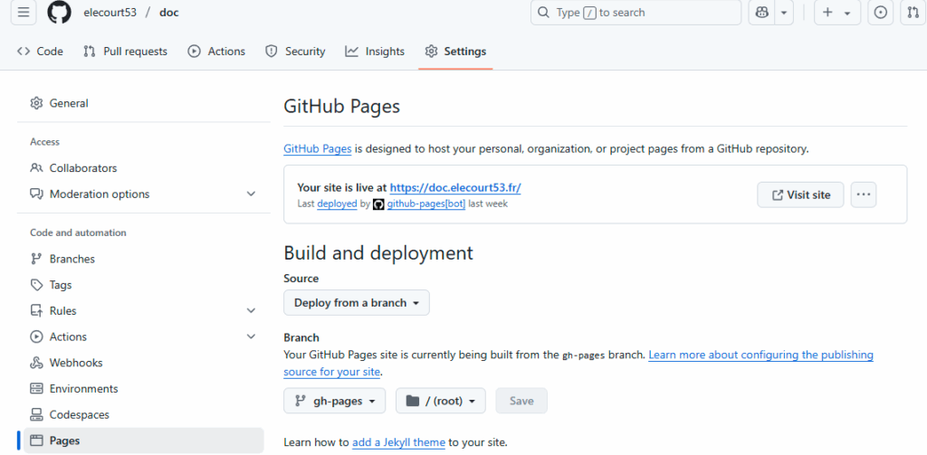 | Configuration du déploiement des pages de la documentation sur GitHub pour passer du Markdown à une page HTML. Aller sur les paramètres de page GitHub sur le repository. Cliquer sur “Deploy from a branch” puis dans branch, sélectionner “gh-pages”. La documentation va donc se déployer automatiquement sous la forme du site sur GitHub. | ![]() |