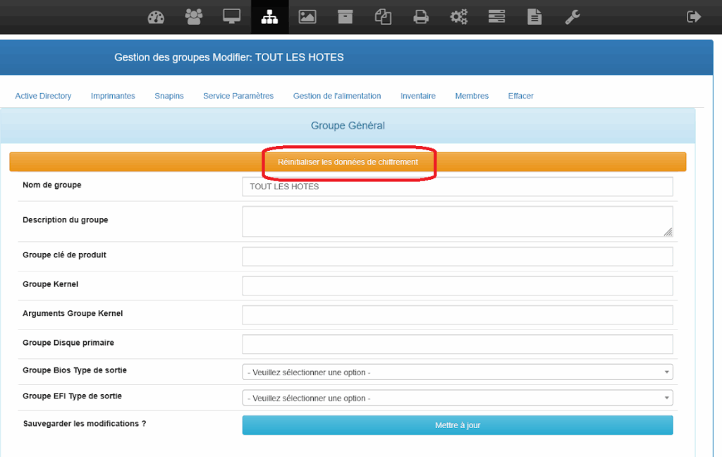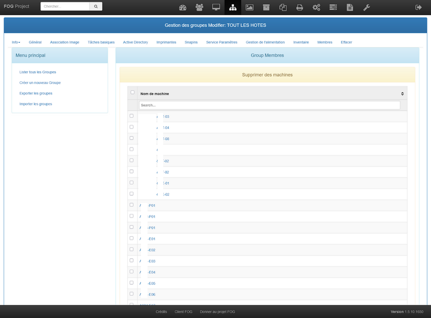 | Après l’installation, il faut réinitialiser le jeton de cryptage du serveur FOG. Il faut créer un groupe de postes, je l’ai appelé : TOUS LES HÔTES”. Puis il faut sélectionner tous les PC présents sur le serveur FOG. | ![]() |