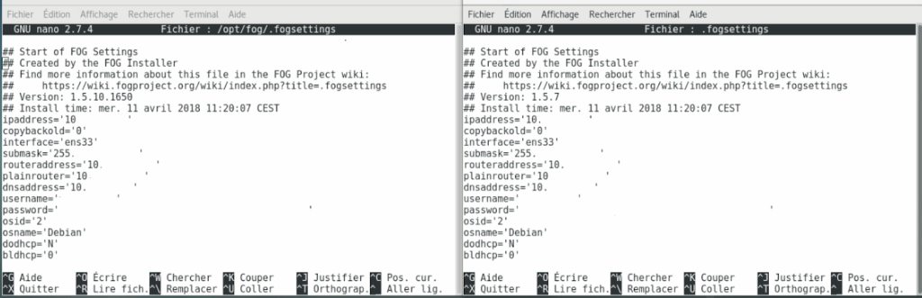| J’ai ensuite vérifié que les paramètres du serveur FOG sont égaux aux anciens : J’ai été dans le fichier /opt/fog/.fogsettings (que j’avais copié avant la migration) | ![]() |