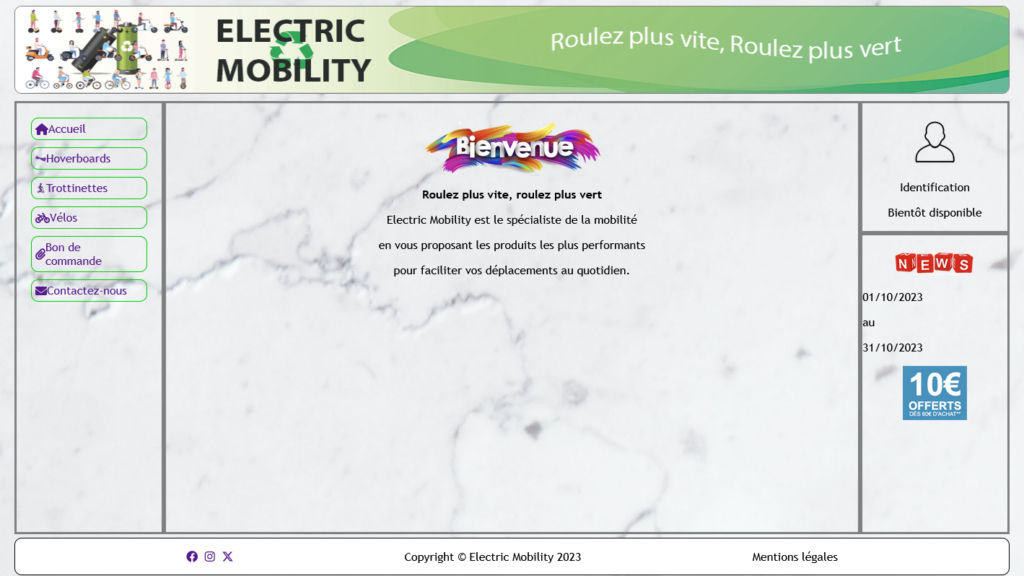 | MOE d’un site internet (ELECTRIC MOBILITY) | – Gérer le patrimoine informatique – Répondre aux incidents et aux demandes d’assistance et d’évolution – Développer la présence en ligne de l’organisation – Travailler en mode projet – Mettre à disposition des utilisateurs un service informatique – Organiser son développement professionnel | – HTML – CSS – PHP | ![]() |