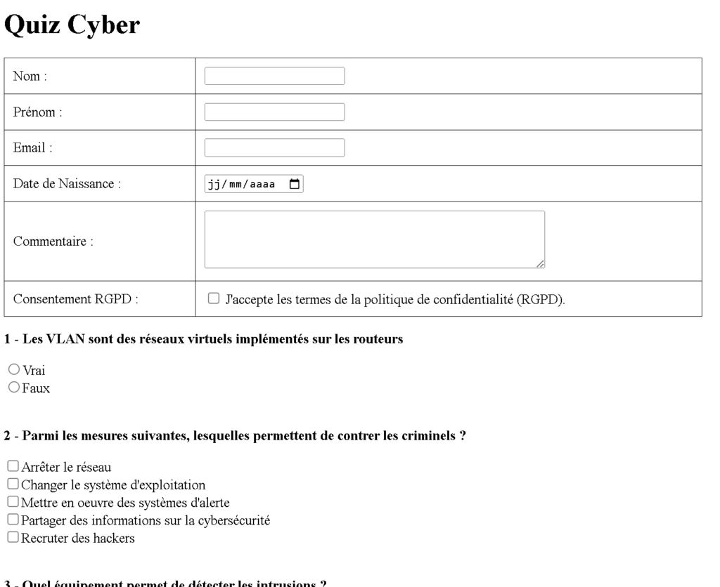 | MOE d’un site internet et d’un hébergement (Quiz Cyber) | – Gérer le patrimoine informatique – Répondre aux incidents et aux demandes d’assistance et d’évolution – Développer la présence en ligne de l’organisation – Travailler en mode projet – Mettre à disposition des utilisateurs un service informatique – Organiser son développement professionnel | Ceci est un quiz sur la cybersécurité hébergé sur un serveur Debian. – Debian – Apache | ![]() |
