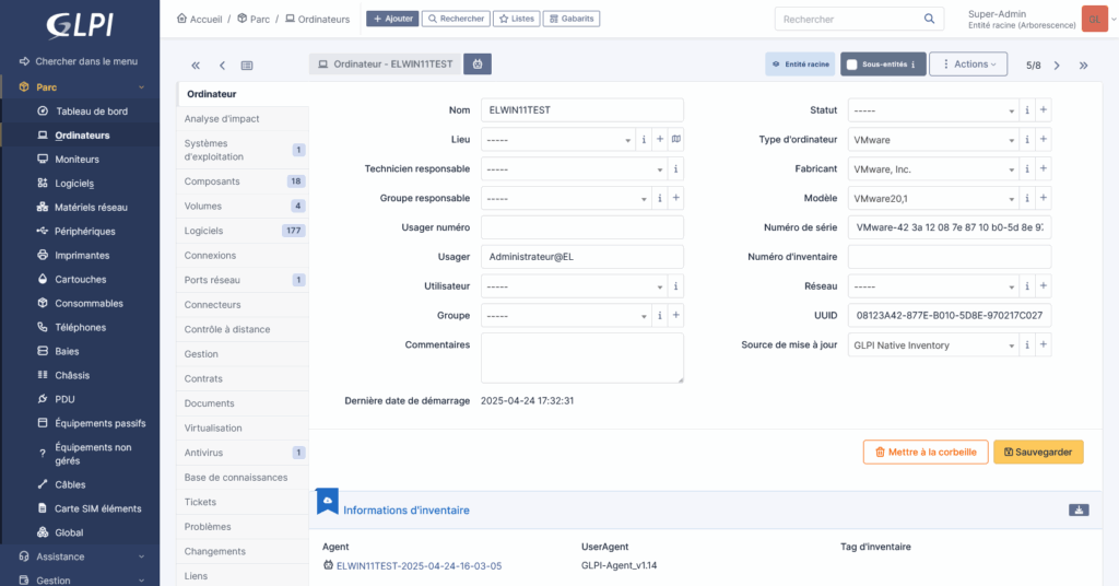 | MOE d’un outil de gestion de parc informatique (GLPI) | – Gérer le patrimoine informatique – Répondre aux incidents et aux demandes d’assistance et d’évolution – Mettre à disposition des utilisateurs un service informatique – Organiser son développement professionnel | Assistance aux utilisateurs | Inventaire du matériel | ![]() |