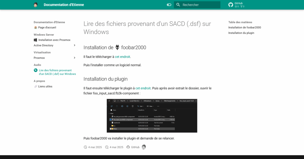 Suite au stage j’ai mis a jour la documentation technique et j’ai donc ajouté des pages comme « Lire des fichiers provenant d’un SACD (.dsf) sur Windows ».