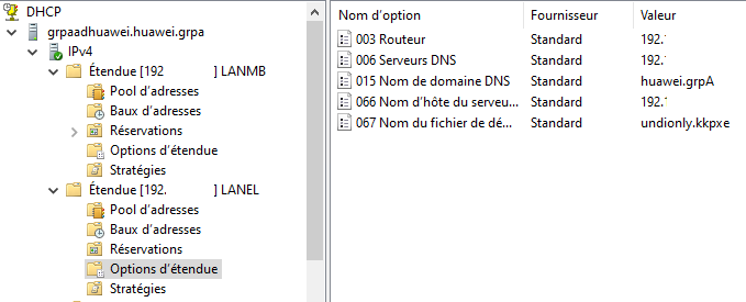 | De plus, il fallait configurer le serveur DHCP, ici Windows Server, pour que les PC démarrent bien par le réseau (PXE) : J’ai donc configuré : – le nom d’hôte du serveur, – le nom du fichier de démarrage. | ![]() |