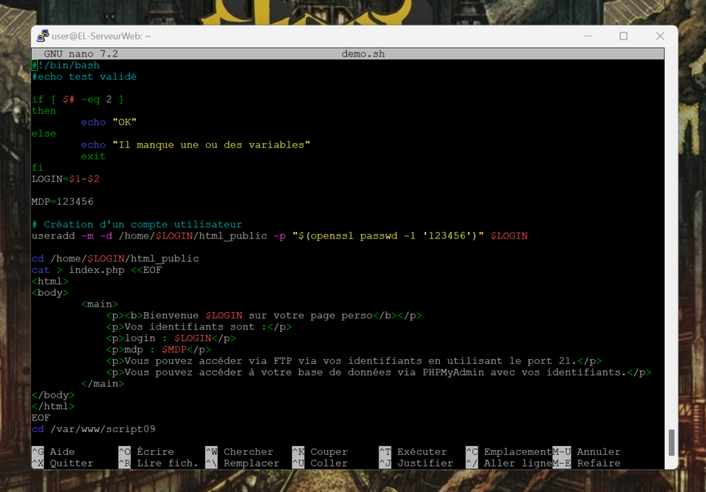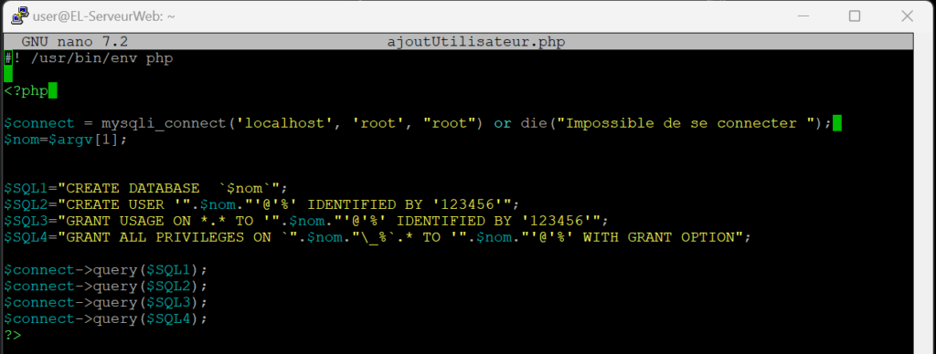 - Création d’un script pour créer un utilisateur sur le serveur Debian et sur la base de donnée.