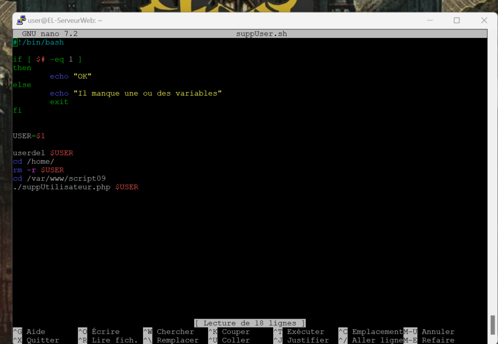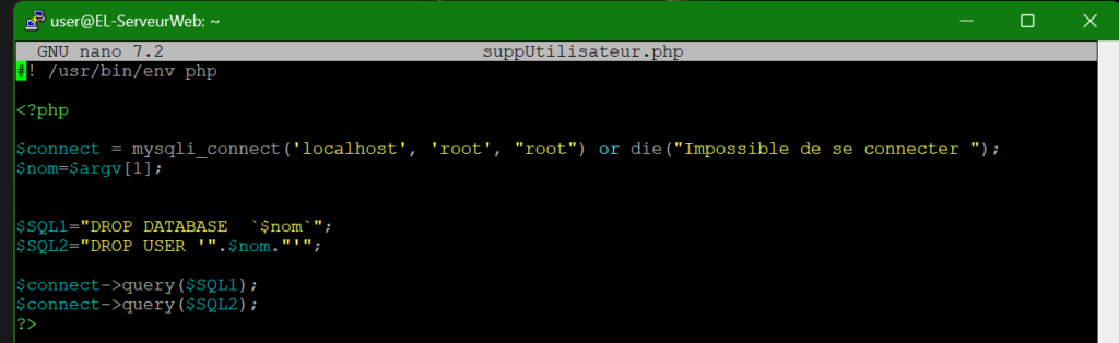 - Création d’un script pour supprimer l’utilisateur Debian, l’utilisateur de la base de données et la base de donnée à son nom.