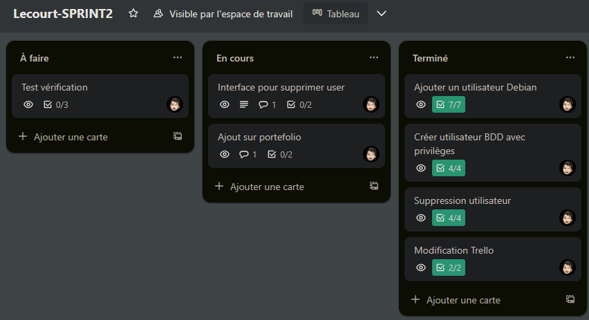 | Pour m’organiser, j’ai utilisé le site Trello pour créer un tableau avec des tâches : – A faire – En cours – Terminé | ![]() |